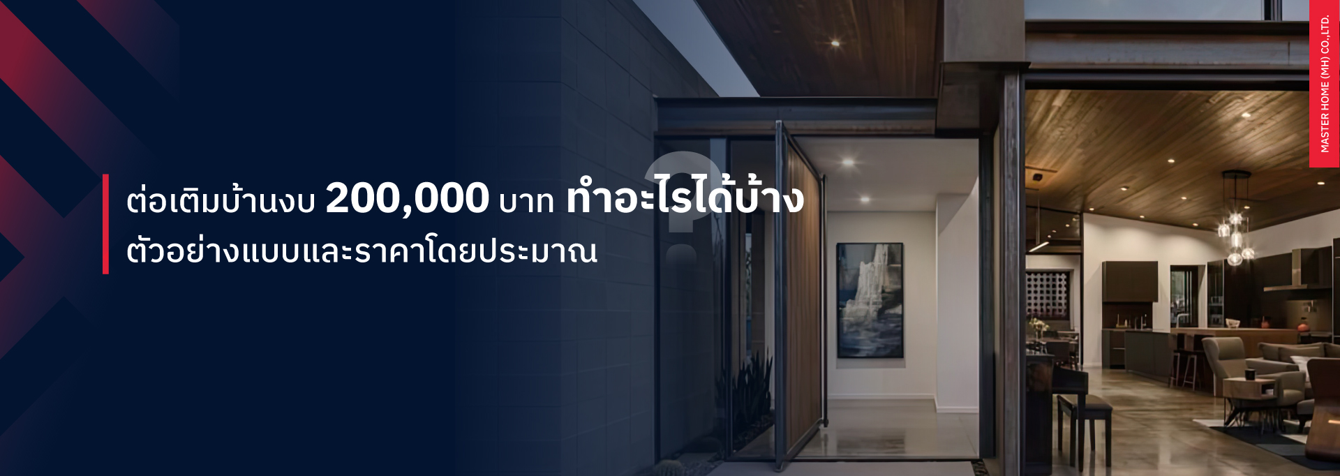 Master Home พร้อมนำเสนอไอเดียและให้คำปรึกษาเกี่ยวกับบริการต่อเติมบ้านแบบครบวงจร ภายใต้งบประมาณ 200,000 บาท มาดูกันว่า ภายใต้งบประมาณนี้ คุณสามารถทำอะไรกับบ้านของคุณได้บ้าง เพื่อเพิ่มฟังก์ชันและสร้างพื้นที่ที่ลงตัวมากยิ่งขึ้น